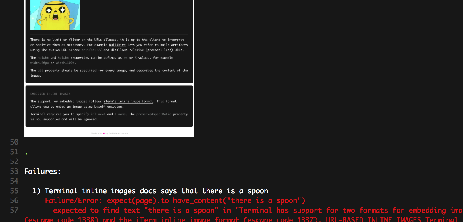 The capybara-inline-screenshot Ruby gem will automatically inline screenshots of your integration test failures and also supports the iTerm image format for viewing failures directly in your terminal. When run under CI it automatically uses the artifact:// URL format.